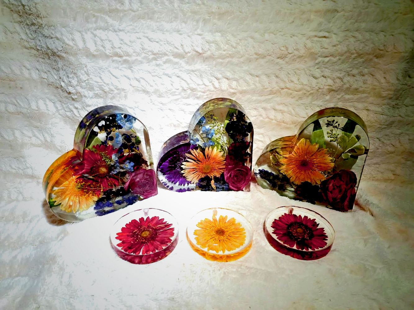 After your flowers are preserved, they can be cast into several resin molds. Options include but are not limited to tables, bookends, serving trays, coasters.